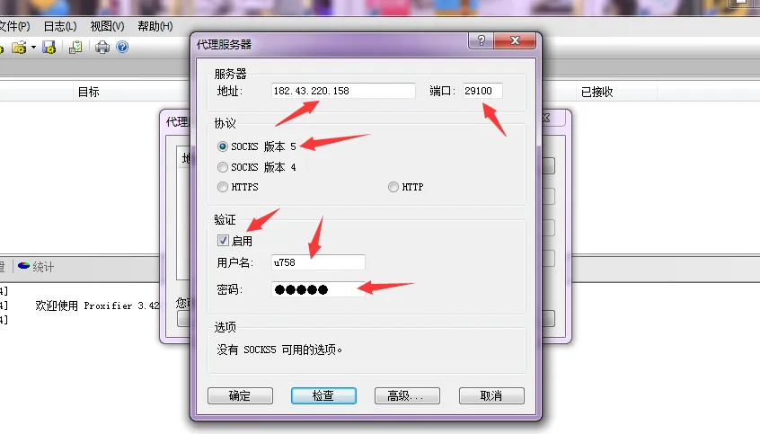4. 填写正确的代理信息 ,注意选择开通正确的协议信息 sk5或http 选择对应 . 如需检查代理是否正常 点击检查